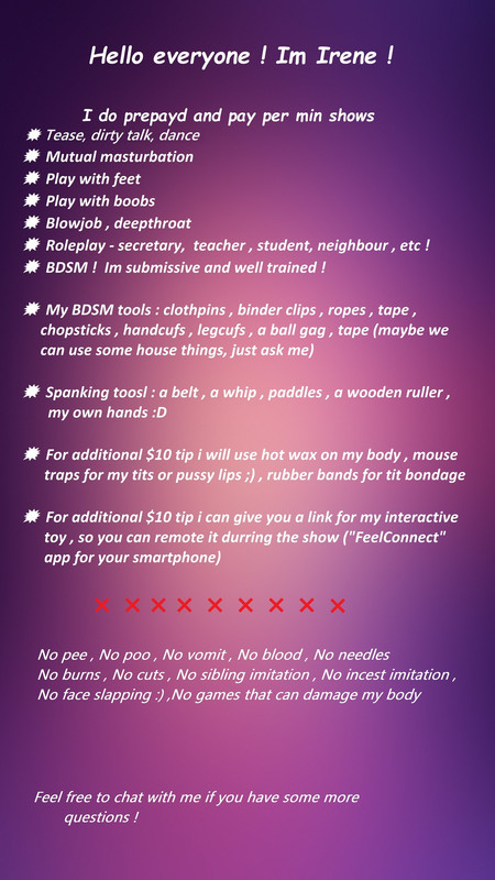 NOCH NICHT, kostenlos registrierenSie müssen GUTHABEN auf Ihr Konto einzahlen, um einen Anruf zu tätigen Blondy_Irene oder jedes andere Modell. Dies ist ein sicheres System, das es Ihnen ermöglicht, für PAY-PER-MINUTE private Skype-Shows zu bezahlen.