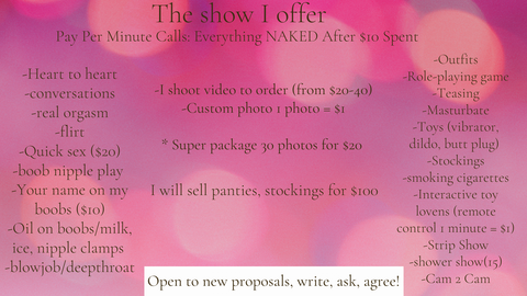 Tudo é possível no show comigo, mas por favor, leve em consideração o fato de que meu conhecimento de inglês é médio, eu consigo entender, mas leva tempo para me fazer uma oferta, então eu gosto de pedir ajuda a um intérprete, mas não se preocupe, eu faço isso rapidamente. Chamadas rápidas não são para mim, eu posso me dar ao luxo de não receber cada chamada por 1-2 minutos, eu prefiro chamadas de 10 minutos. Por favor, seja diplomático comigo.