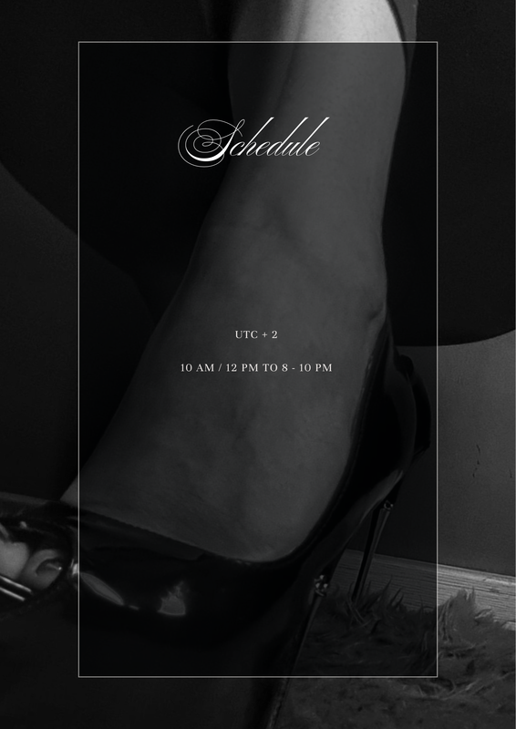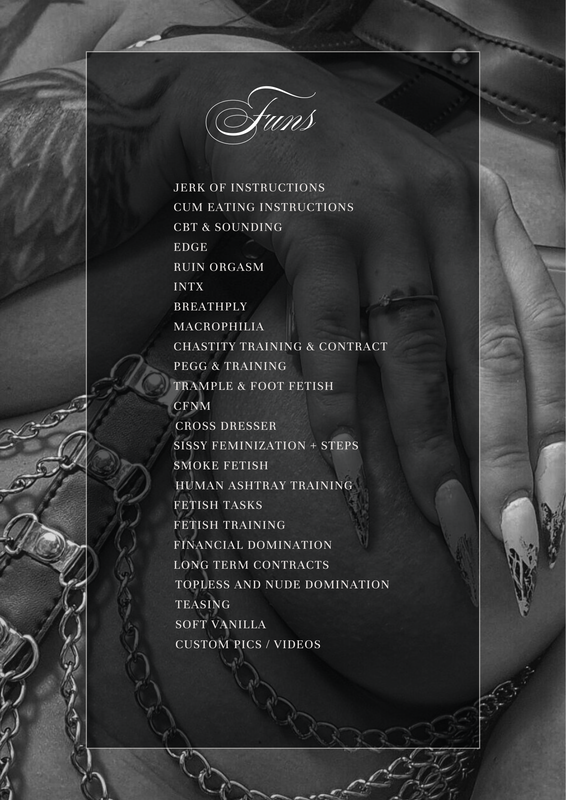 - fastresponse, bdsm, mistress, lush, piercing, tattoos, femdom, smoke, tease, leather, strapon, findom, fetishes, longnails, softvanilla, longterm, nakednude, directpayment, highboots, goodenglish, trainingsession