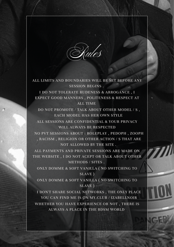 See more models from Izabel's tags: fastresponse / BDSM / Mistress / Lush / Piercing / Tattoos / FemDom / Smoke / Tease / Leather / Strapon / FinDom / Fetishes / Longnails / SoftVanilla / Longterm / NakedNude / DirectPayment / Highboots / Goodenglish / Trainingsession