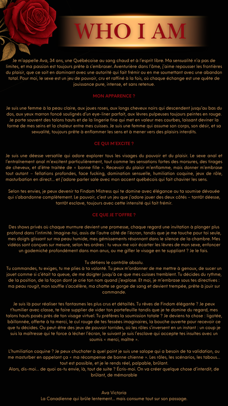 Vedi più modelli dai tag di Princess Ava Victoria: roleplay / milf / findom / tattoos / cei / bdsm / masturbation / french / sensual / submissive / orgasm / master / Amateur / ASMR / canada / quebec / soloplay / content / interactivetoys / JOI