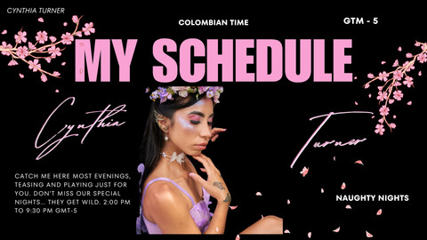 Poți SOLICITA O ÎNTÂLNIRE cu CynthiaTurner atunci când îți este convenabil. Totul este în fusul tău orar, în orele tale locale. Ea va primi solicitarea ta și o va accepta dacă programul ei este liber. Vei primi o confirmare prin email și te poți pregăti pentru experiența ta incitantă.