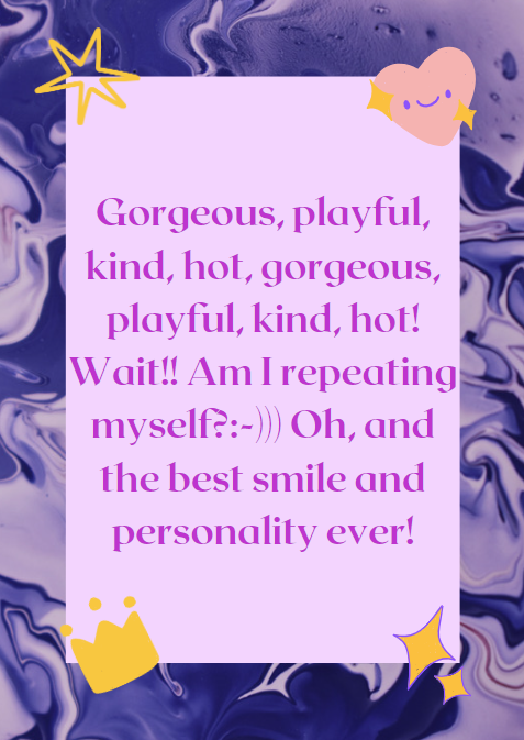 Sono la combinazione della ragazza carina della porta accanto che ti tira sempre su il morale e ti fa sciogliere il cuore E della donna sexy e desiderabile che fa avverare i tuoi sogni maliziosi. Sii qui per me e impara a conoscermi, sono sicuro che diventerai tutto mio