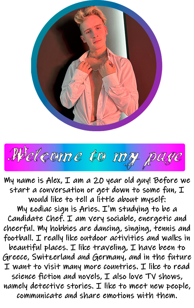 Меня зовут Алекс, мне 20 лет! Прежде чем мы начнем разговор или перейдем к веселью, я хотел бы немного рассказать о себе: