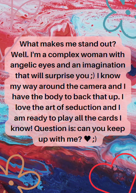Я знаю, как влюбить в себя мужчину, я знаю свои формы, свое очарование и привлекательность. Позвольте мне поразить вас моим самым сексуальным дразнением, моим самым озорным эротическим танцем и многими вещами, которые может предложить мое воображение;) Сможете ли вы идти в ногу со мной?