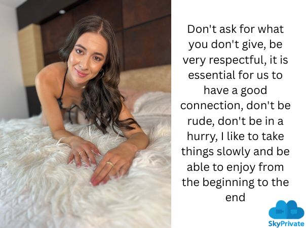 Не проси того, чего не даёшь, будь очень уважителен. Нам важно поддерживать хорошие отношения. Не груби, не торопись. Мне нравится не торопиться и наслаждаться всем от начала до конца. Я также люблю танцевать, читать, учиться, не в последнюю очередь путешествовать. Ты же знаешь, что мне нравится узнавать о других культурах, поэтому я хочу, чтобы ты рассказал мне о себе. Можешь поговорить со мной, я с удовольствием тебя выслушаю. Мы можем поговорить о твоих сексуальных фантазиях, о твоих вещах. Если хочешь, я расскажу тебе и о себе.